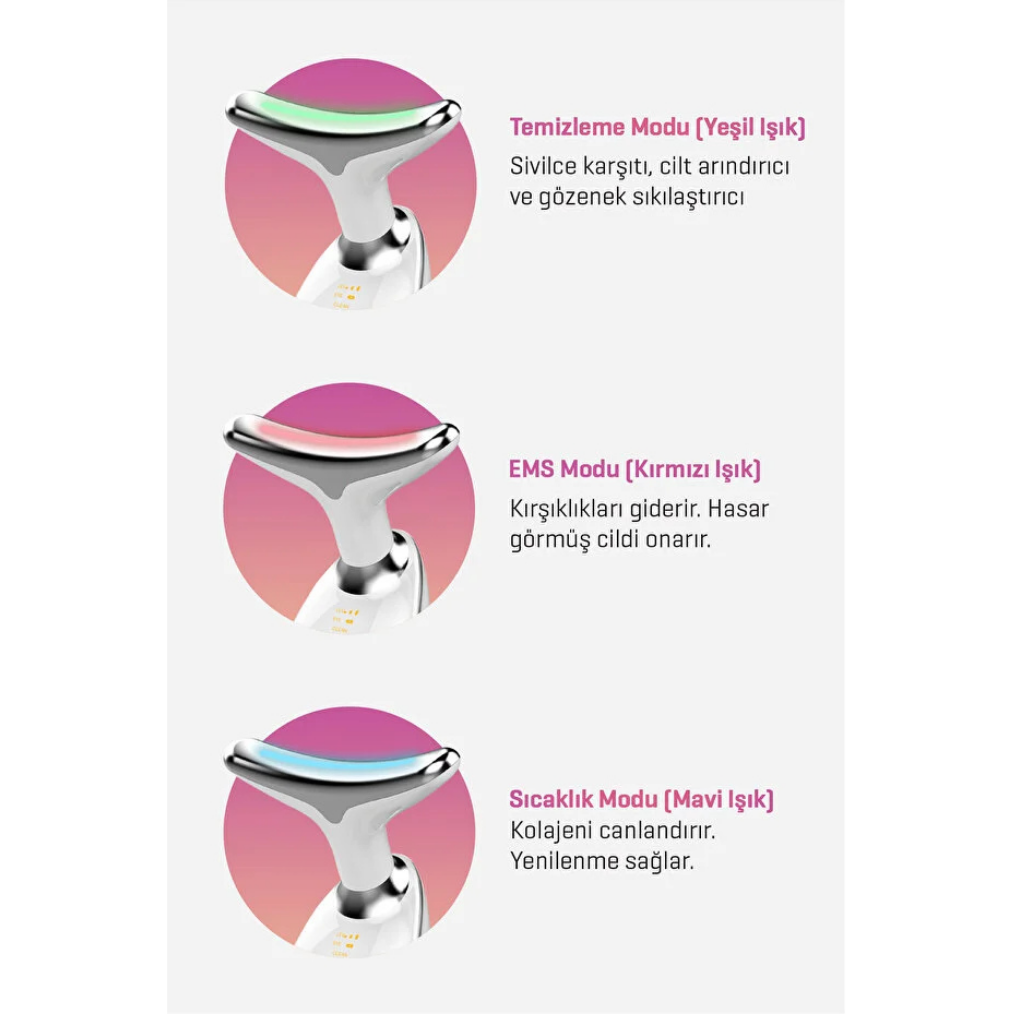 - Mod Seçimi ve Masaj: Tercih ettiğiniz LED modunu seçin ve cihazı cildinizin üzerinde yavaşça yukarı doğru kaydırın. En iyi sonuçlar için günde 5-10 dakika kullanın.